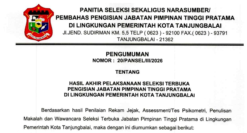 Klik Pengumuman Disini: https://bkpsdm.tanjungbalaikota.go.id/wp-content/uploads/2026/03/PENGUMUMAN-HASIL-AKHIR-SELEKSI-TERBUKA-JPTP-2026.pdf