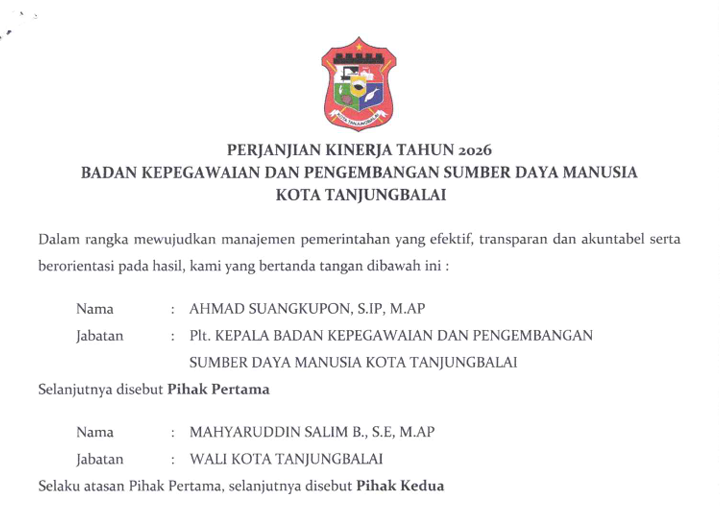 Dokumen Perjanjian Kinerja pada Badan Kepegawaian dan Pengembangan Sumber Daya Manusia Kota Tanjungbalai Tahun 2026 Posted on 14 April 2026 by admin Klik disini : https://bkpsdm.tanjungbalaikota.go.id/wp-content/uploads/2026/04/Perjanjian-Kinerja-BKPSDM-TA.-2026-1-2.pdf Klik disini: https://bkpsdm.tanjungbalaikota.go.id/wp-content/uploads/2026/04/Perjanjian-Kinerja-BKPSDM-TA.-2026-1-2.pdf